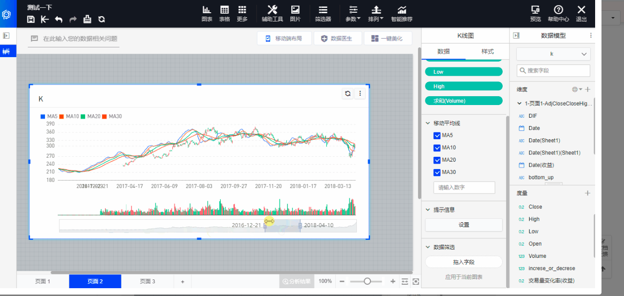 用户可额外拖入一个度量,将以下方柱形图的方式进行展示。示例在此处拖入了交易量,以颜色对涨跌情况做了区分。