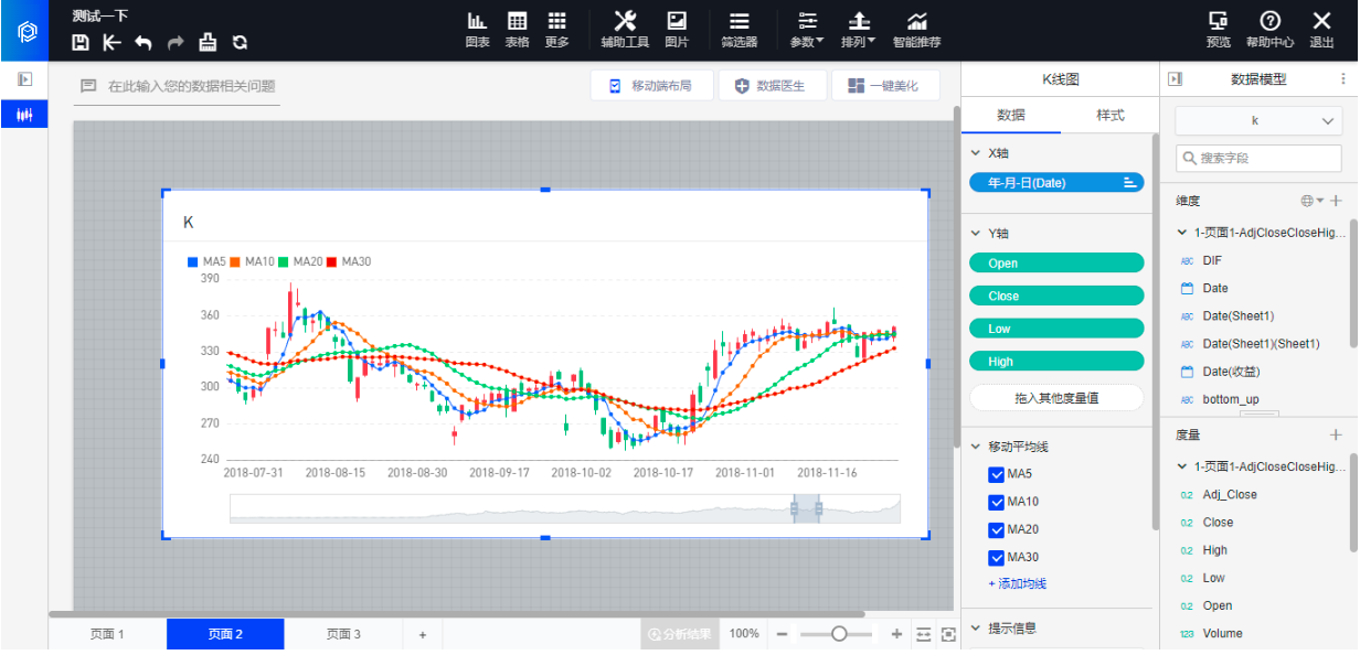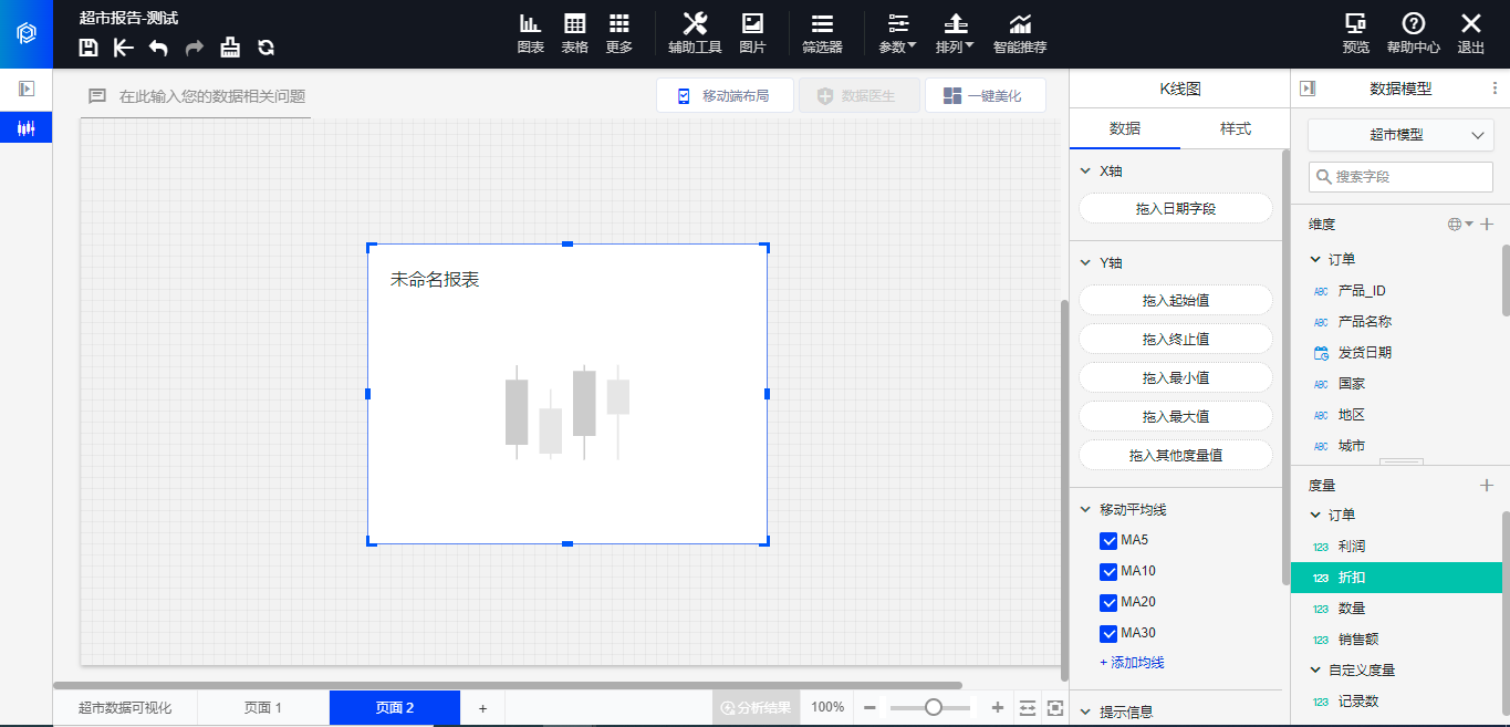 将日期、开盘价、收盘价、最高价与最低价分别拖至轴上的日期、起始值、终止值、最大值与最小值,将根据不同的日期粒度绘制不同粒度的K线图。