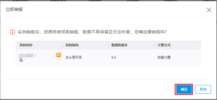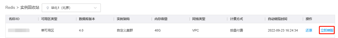 3.在实例回收站页面,可选择您想要还原的实例,点击立即销毁,弹出确认弹窗,点击确认,回收站实例立即销毁,数据不再保留且不可恢复。