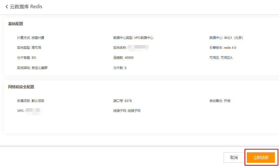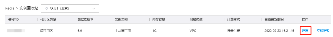 3.在实例回收站页面,可选择您想要还原的实例,点击还原,进入确认实例信息页面。