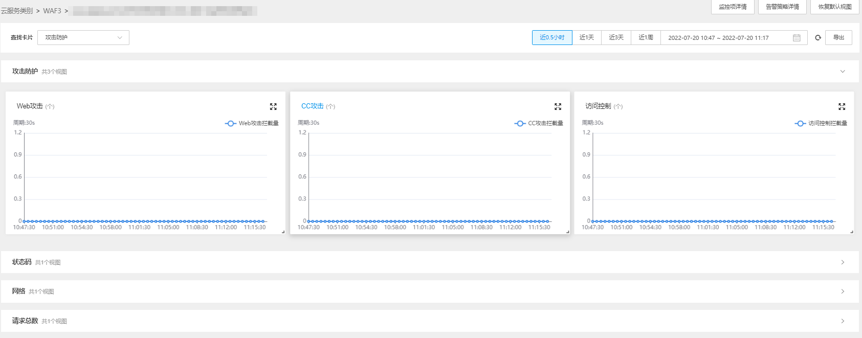 6.png查找卡片搜索框可选择查看攻击防护、状态码、网络、请求总数图表,右侧可选择统计时间段。