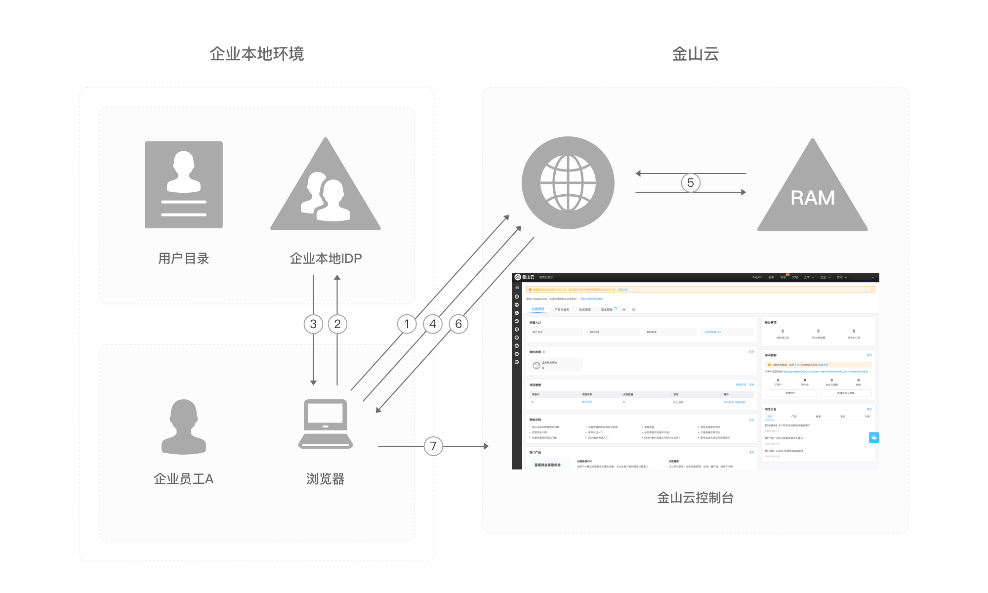 说明:以上第1步中 企业员工也可以在企业自有IdP的登录页直接单击登录到金山云的链接,向企业IdP发出登录到金山云的SAML认证请求。企业员工在金山云控制台登录并不是必须的。