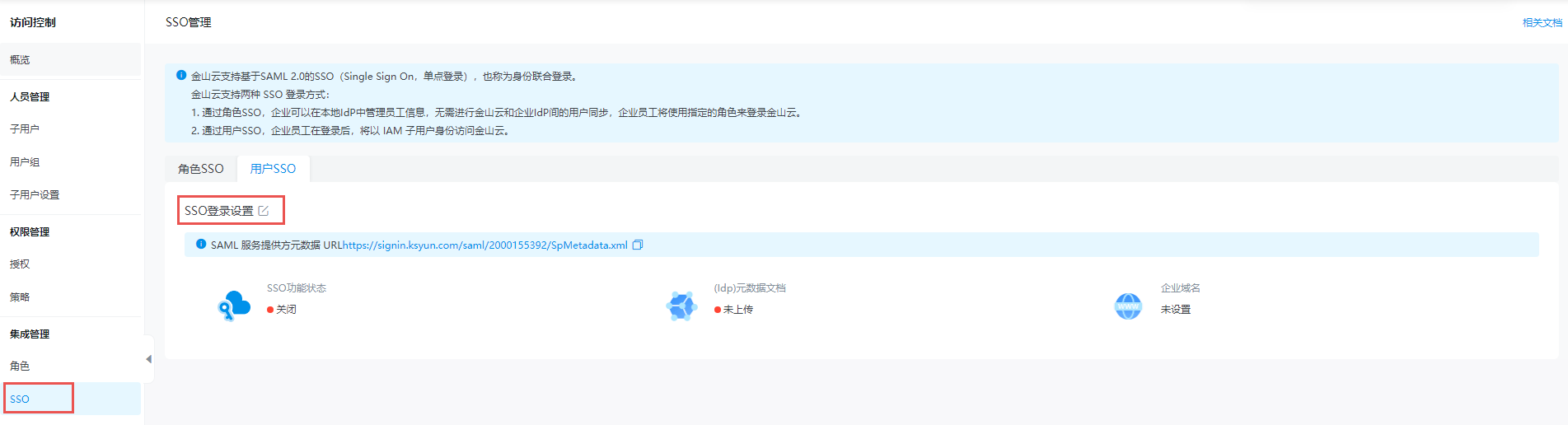 基于SAML 2.0的用户SSO,配置对应元数据来建立金山云对企业身份提供商(IdP)的信任,实现企业IdP通过用户SSO登录金山云。