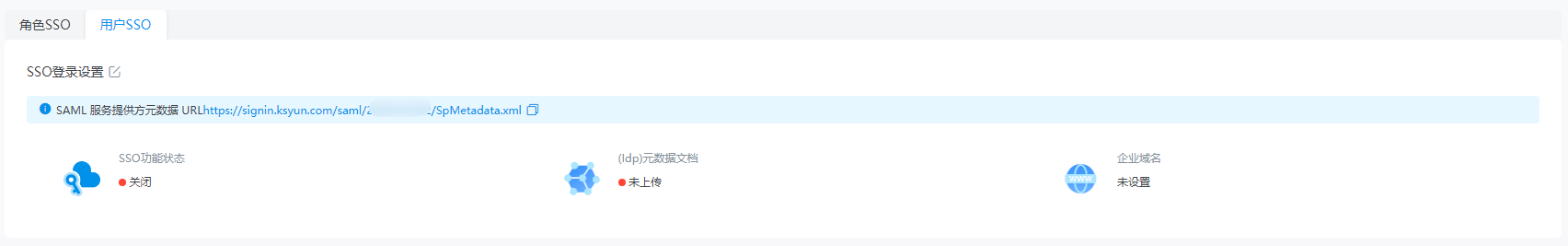 在SSO登录设置区域,查看当前金山云账号的SAML服务提供商元数据URL。