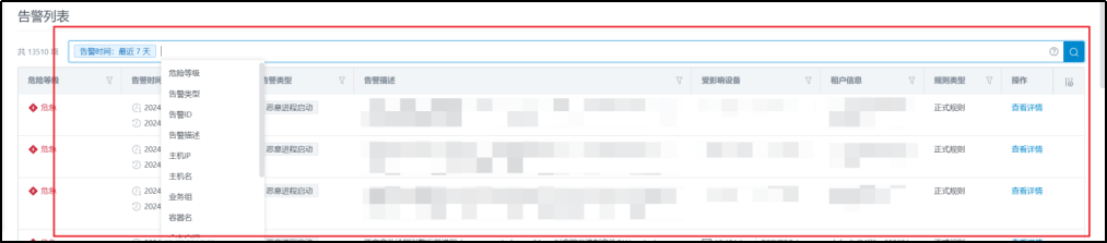 搜索时必须设置指定告警时间范围,默认为最近7天