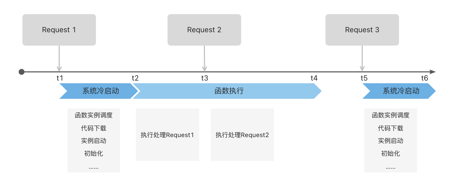 如下图所示,如请求2在函数实例被释放前发生,由于函数执行环境已经准备好,请求2将无需等待函数实例的冷启动时间,在已有的函数实例环境中被执行。如请求3在函数实例被释放后发生,函数执行环境被释放,请求3需等待一个新的函数实例的冷启动时间。