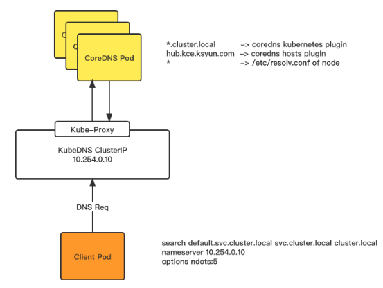 client pod 根据/etc/resolv.conf中的配置,将 dns 请求转发到 coreDNS clusterIP 上去。