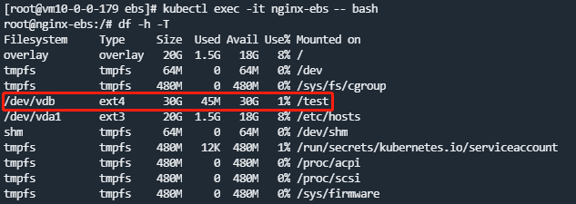 待Pod正常运行后,执行df -h -T命令查看盘的大小、挂载路径和文件系统类型均正确。