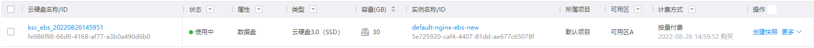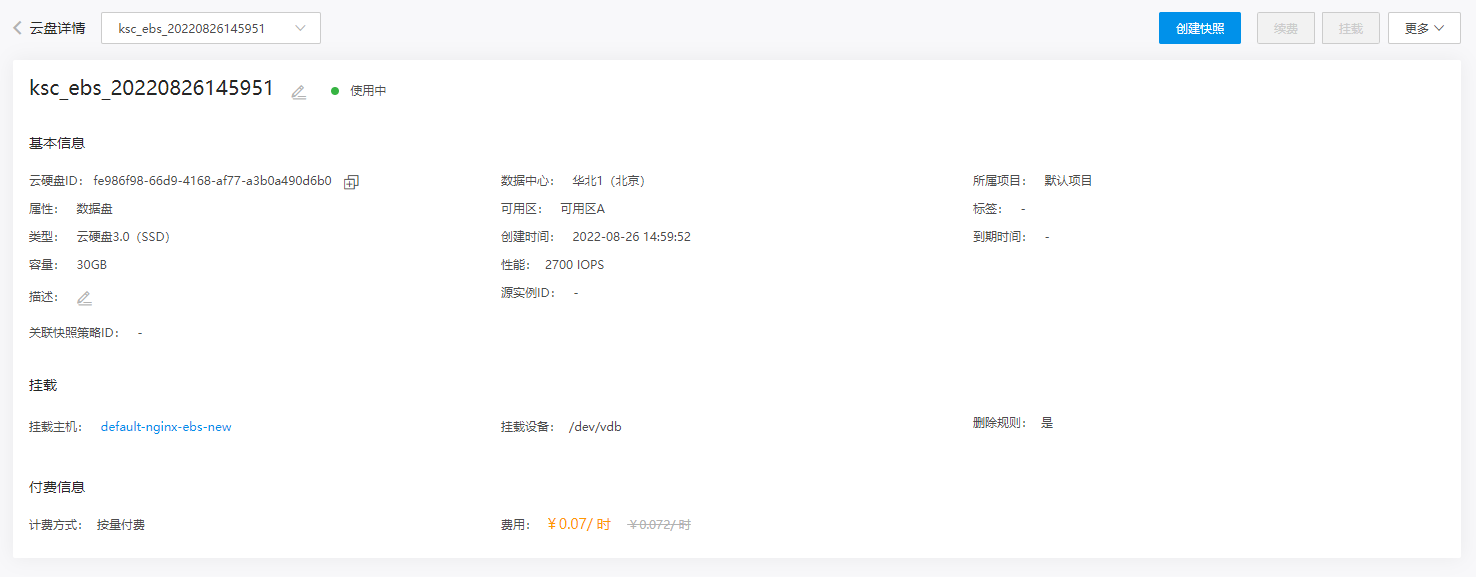在云硬盘的详情页,“挂载主机”显示容器实例的名称,“挂载设备”显示云硬盘的设备文件名。