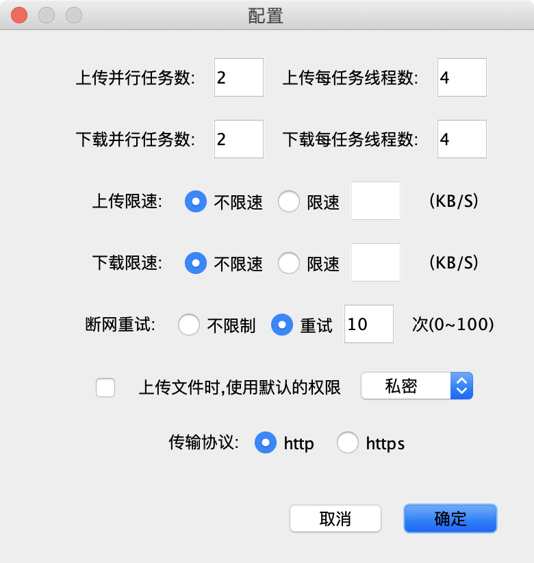 可以设置同时上传/下载任务的数量,该数量不超过10;可以设置上传限速和下载限速;可以设置断网重试的次数。