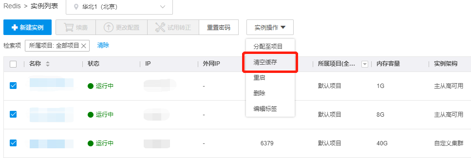 3.选择想要清空缓存的一个或多个实例,并在实例操作下拉框选择清空缓存,此操作将执行FLUSHALL命令清除所选实例的所有缓存数据,清除后数据无法找回。