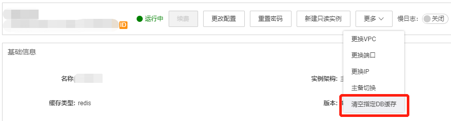 4.选择更多下,清空指定DB缓存操作,此操作将执行FLUSHDB命令清除该实例下所选DB的所有数据,清除后数据无法找回。