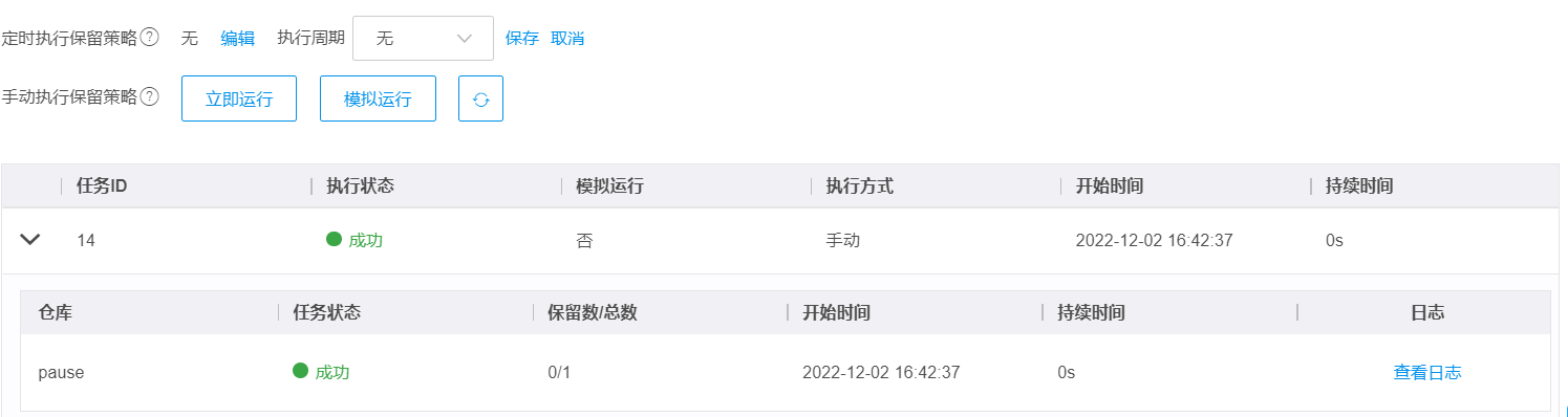 在执行版本保留策略后,您可在执行日志列表中查看每次策略执行的关键日志信息。