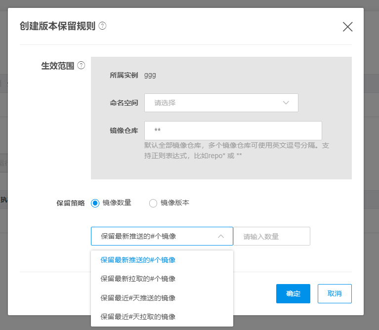 - 保留策略:支持根据镜像数量策略保留或根据镜像版本策略保留。镜像数量策略中,支持保留最近推送/拉取的指定数量镜像,或保留最近指定天数推送/拉取的镜像;镜像版本策略中,支持根据您配置的版本规则匹配镜像版本,对满足版本规则的镜像进行保留,此外对于无镜像版本的镜像,您可勾选是否将无镜像版本的镜像加入保留策略。