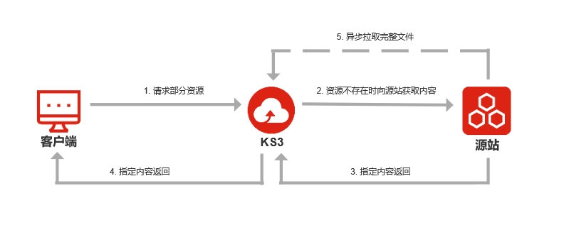 对于Range请求:KS3会同时请求部分数据返回给用户,然后异步拉取全部数据存储至KS3。