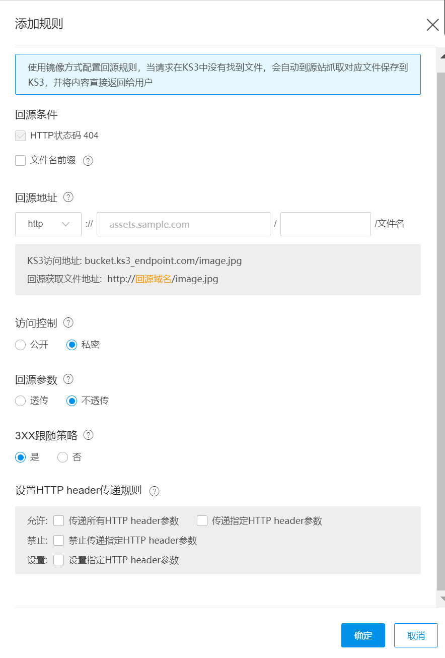 3XX跟随策略 | 否 | 默认选中”是”,即跟随源站3XX重定向请求获取到资源,并且将资源保存到KS3上。若用户选择”否”,KS3会透传3XX响应给客户端,而非跟随3XX地址。 |