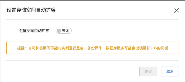 自动扩容可能会导致实例发生切换和重启,数据库服务可能会出现最长30S的闪断。