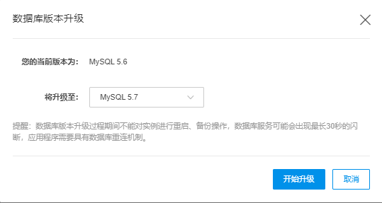 3.在数据库升级过程中,云数据库MySQL服务会出现闪断,请您尽量在业务低峰期执行升级操作,或确保您的应用有自动重连机制。