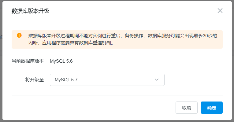3.在数据库升级过程中,云数据库MySQL服务会出现闪断,请您尽量在业务低峰期执行升级操作,或确保您的应用有自动重连机制。