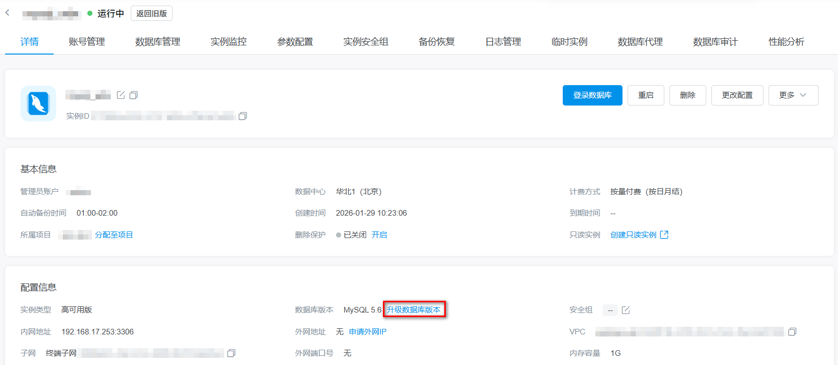 1.登录RDS控制台,选择需要升级的实例,进入详情页,在配置信息区域点击升级数据库版本。