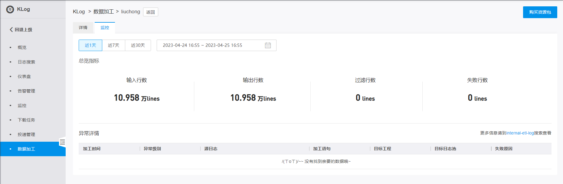 在监控页签,您可查看该任务近30天总览指标,包括日志数据输入行数、输出行数、失败行数、过滤行数。异常详情中默认展示最近200条加工失败日志的详情,更多日志详情到当前工程下internal-etl-log日志池中查看。