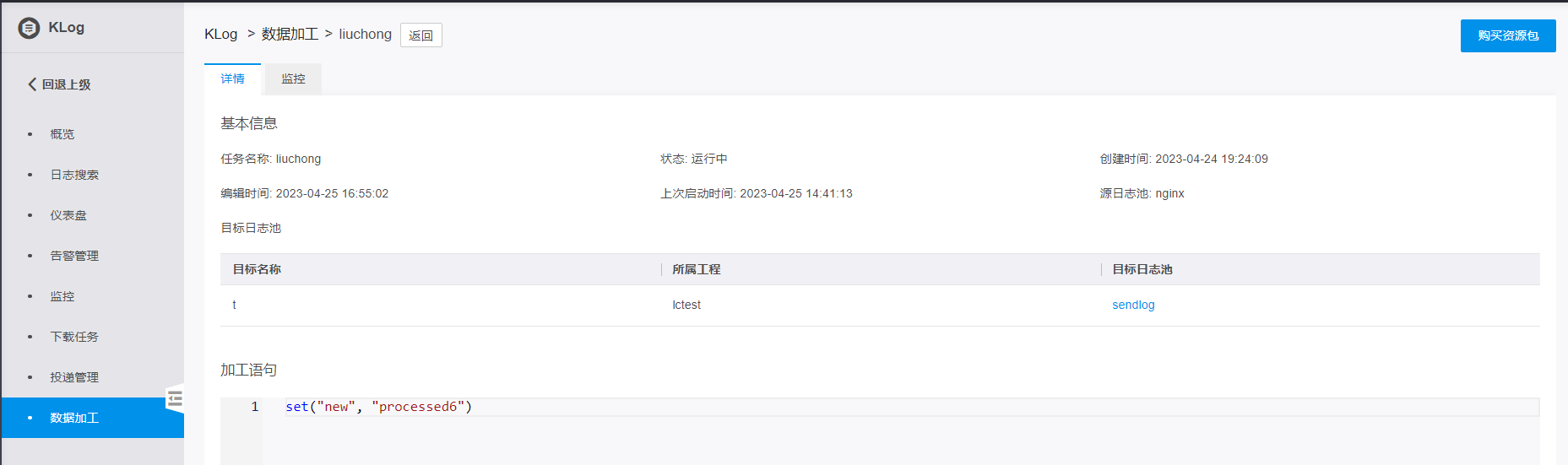 在详情页签,可以查看到该加工任务的基本配置、源日志池、目标日志池以及加工语句。 此外,您可单击目标日志池,快速跳转到该日志池的查询页面。
