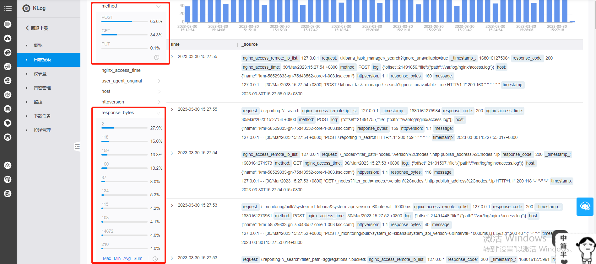操作步骤 1、登录金山云日志服务Klog控制台。 2、在工程列表,点击某一工程名称,进入该工程的详情页,找到对应日志池,点击搜索 3、进入日志搜索页面,在原始日志页签的快速分析区域,单击目标字段。