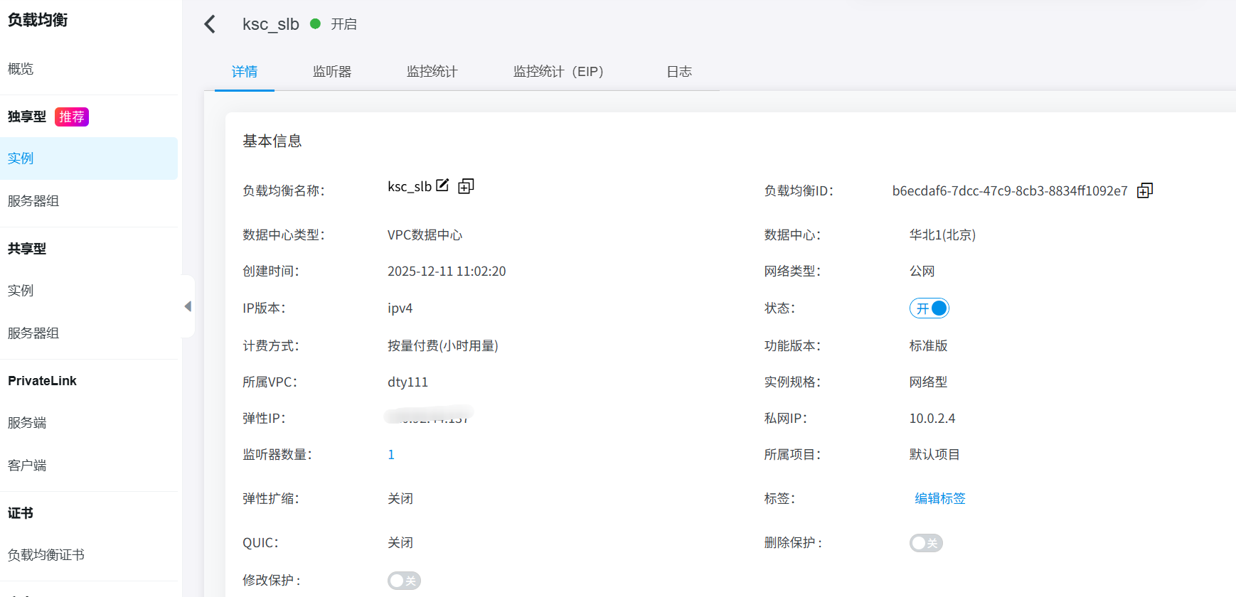 实例详情页可以开启删除保护和修改保护功能。用于控制独享型SLB实例是否能被删除和修改,若开启删除保护,则独享型SLB实例不允许被删除;若开启修改保护,则独享型SLB实例不允许被编辑,其下的监听器不允许被删除或编辑。若您创建的独享型SLB实例期望不被变更,可使用该功能。