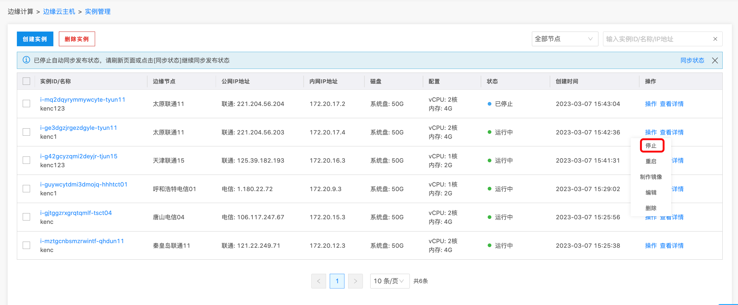 2. 在实例列表处,点击某个实例的操作按钮,并选择停止,如下图所示:
