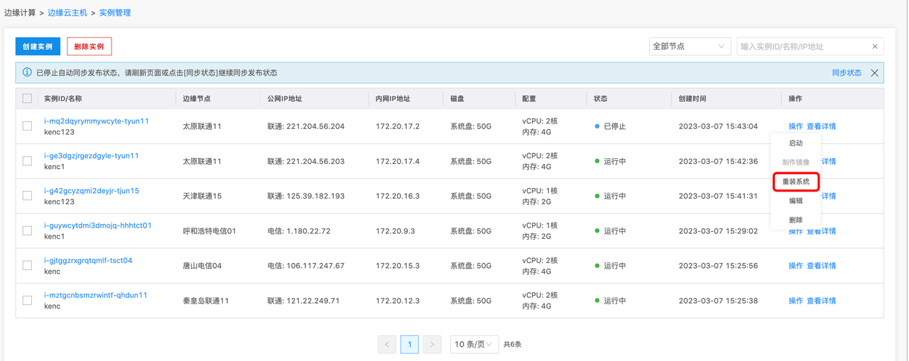 在实例列表处,点击某个实例的操作按钮,并选择重装系统,如下图所示: