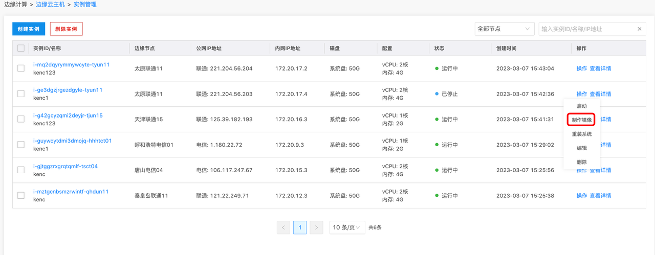 在实例列表处,点击某个实例的操作按钮,并选择制作镜像,如下图所示: