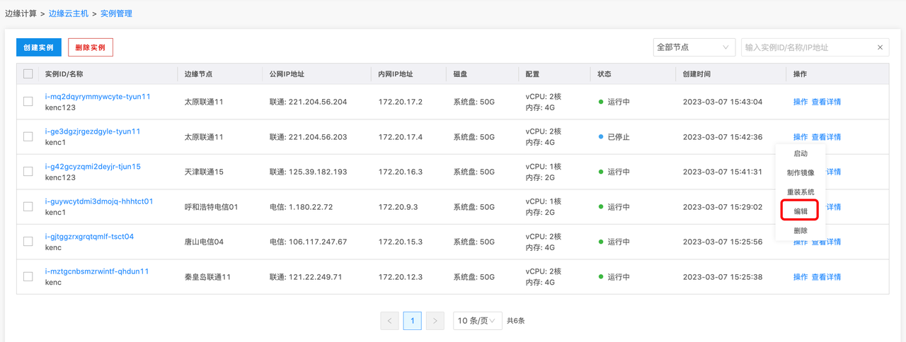 2. 在实例列表处,点击某个实例的操作按钮,并选择编辑,如下图所示: