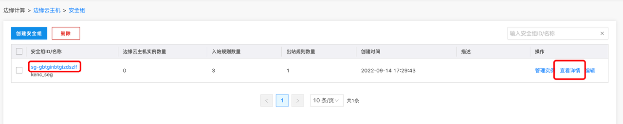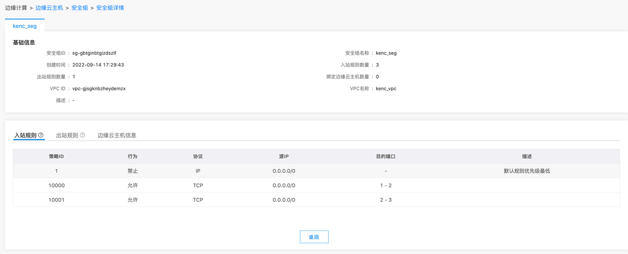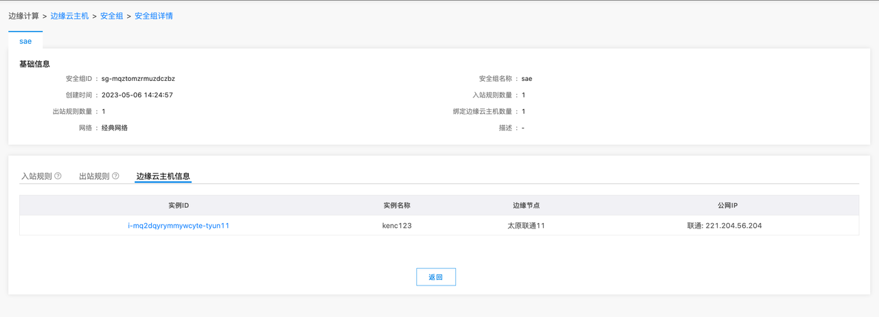 进入安全组详情页面后,即可查看安全组的基本信息、出入站规则以及边缘云主机的信息,如下图所示: