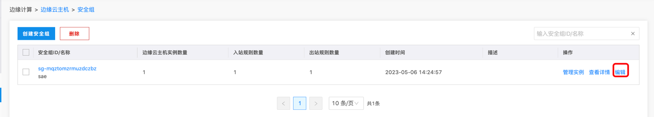 在安全组列表处,点击某个安全组的编辑,如下图所示: