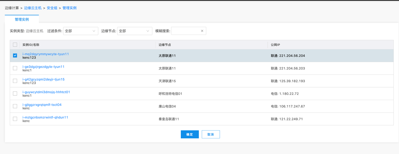 进入安全组管理实例页面后,可以对安全组进行实例的绑定,通过勾选实例的方式进行绑定,如下图所示: