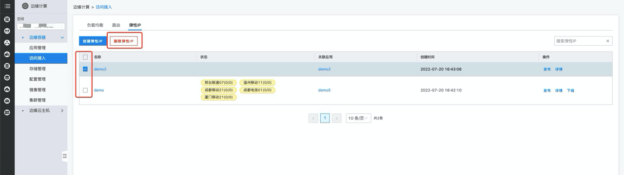 在访问接入管理中,您可以在弹性IP列表处对弹性IP进行勾选删除,如下图所示:
