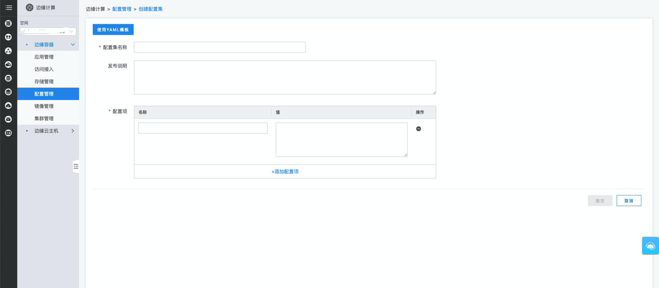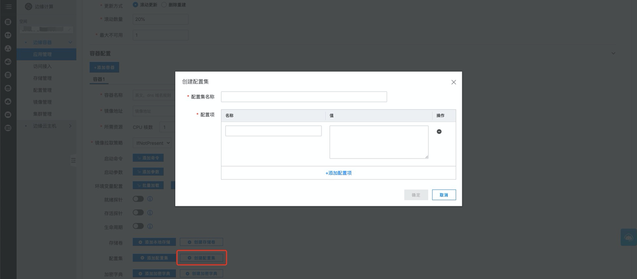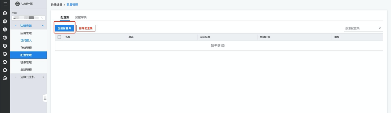 创建完成后您可在配置管理的配置集列表处管理您的配置集;您也可以在创建或编辑应用时将配置集与边缘容器进行绑定,具体操作可参考创建应用。