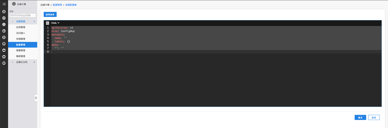 进入创建配置集页面后,您需要填写配置集的配置信息或使用YAML模板进行创建: