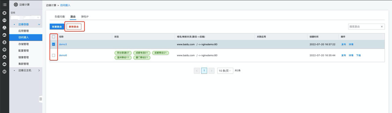 在路由管理中,您可以在路由列表处对路由进行勾选删除,如下图所示: