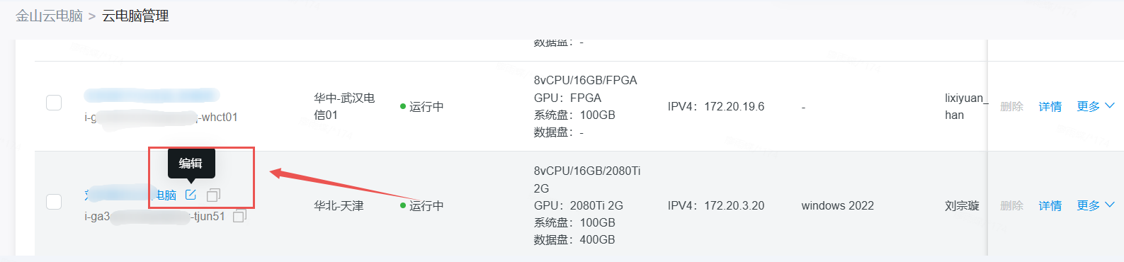 2. 在云电脑列表处,点击云电脑名称旁边的编辑按钮即可对云电脑名称进行编辑;