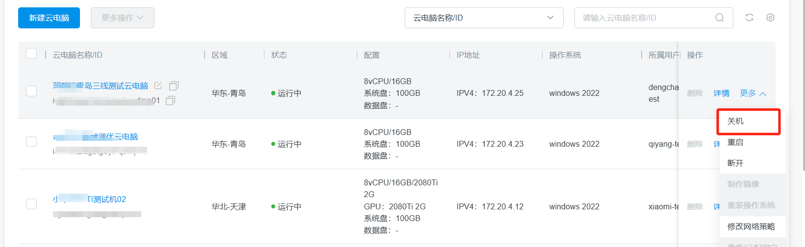 2. 在云电脑列表处,点击云电脑更多操作状态里的关机,如下图所示: