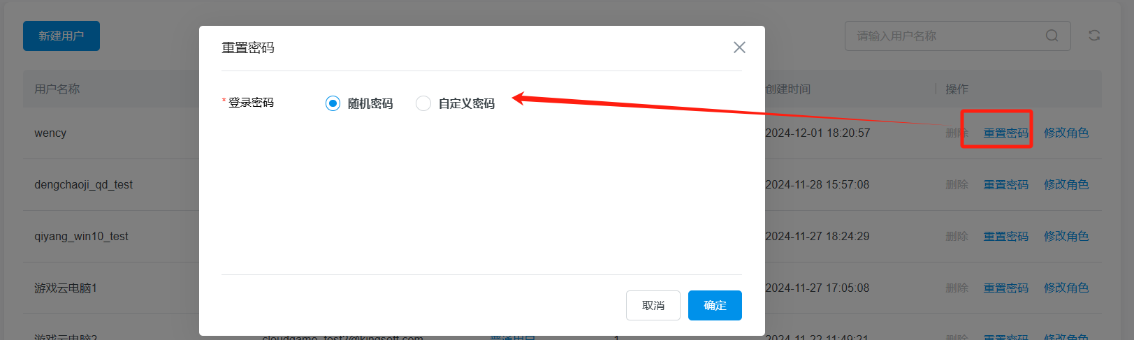 在用户列表处,点击操作中的重置密码,选择密码的方式即可完成密码的重置。