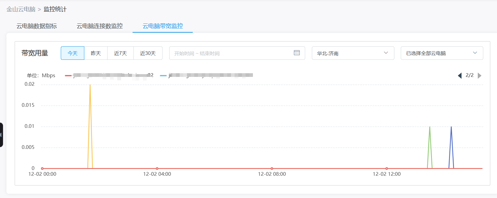 带宽用量监控支持查看某区域云电脑的带宽用量,细分为入向带宽和出向带宽,并且可以按照区域、云电脑和时间线进行查询,如下图所示: