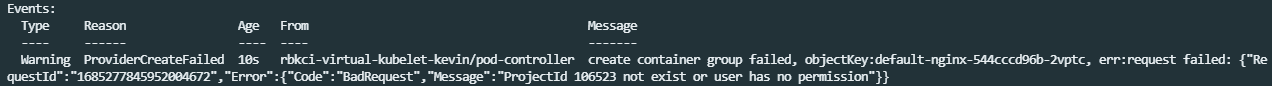 nodeName: rbkci-virtual-kubelet # 指定nodeName将pod调度到虚拟节点上2.创建容器实例失败,出现下图所示报错提示没有权限。