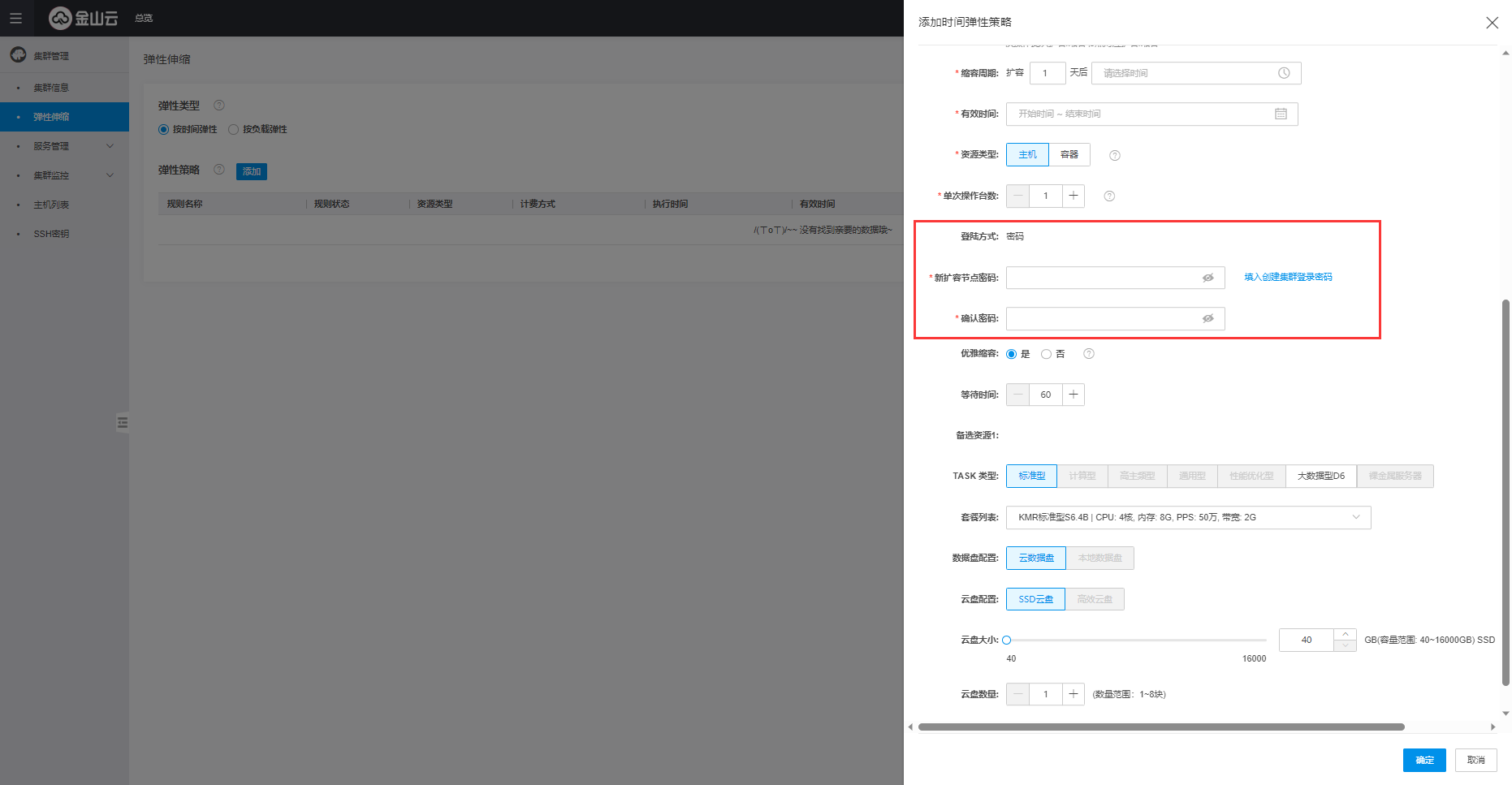 如果集群创建时选择密码登录,则添加弹性伸缩策略时需要填写新扩容节点的密码,支持自动填充为创建集群时的密码,点击填入创建集群登录密码即可。