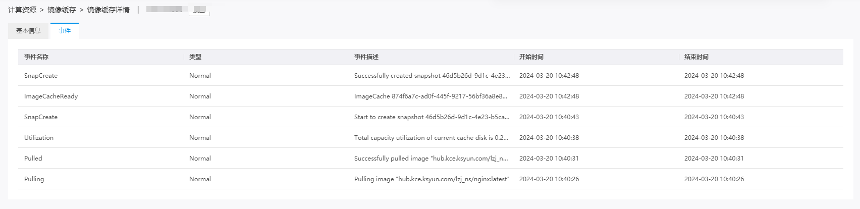 6.点击镜像缓存名称,可以打开详情页面,查看镜像缓存基本信息与镜像缓存创建事件。
