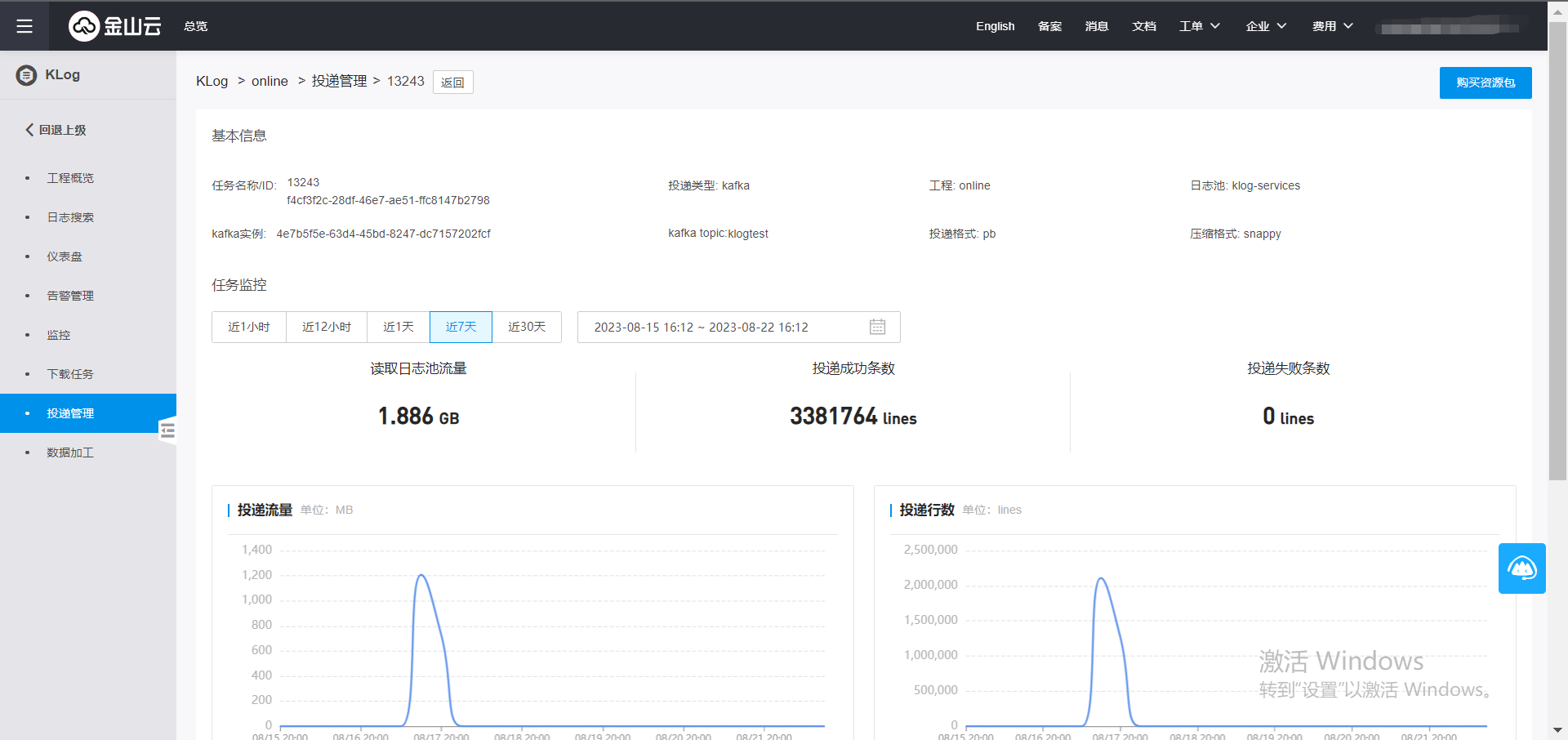 4、在左侧导航栏中,点击投递管理,新建投递任务,投递类型选择kafka,填写配置信息参考下表。
