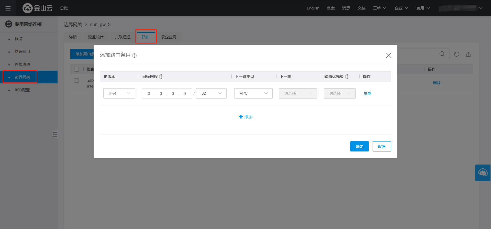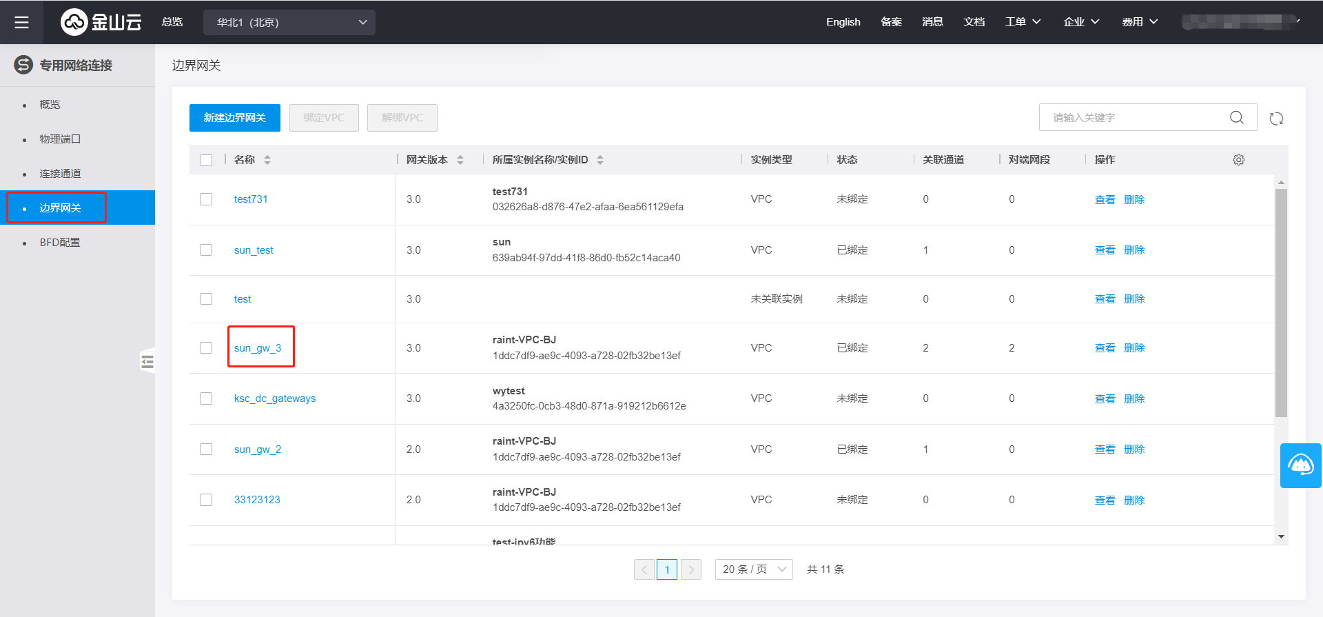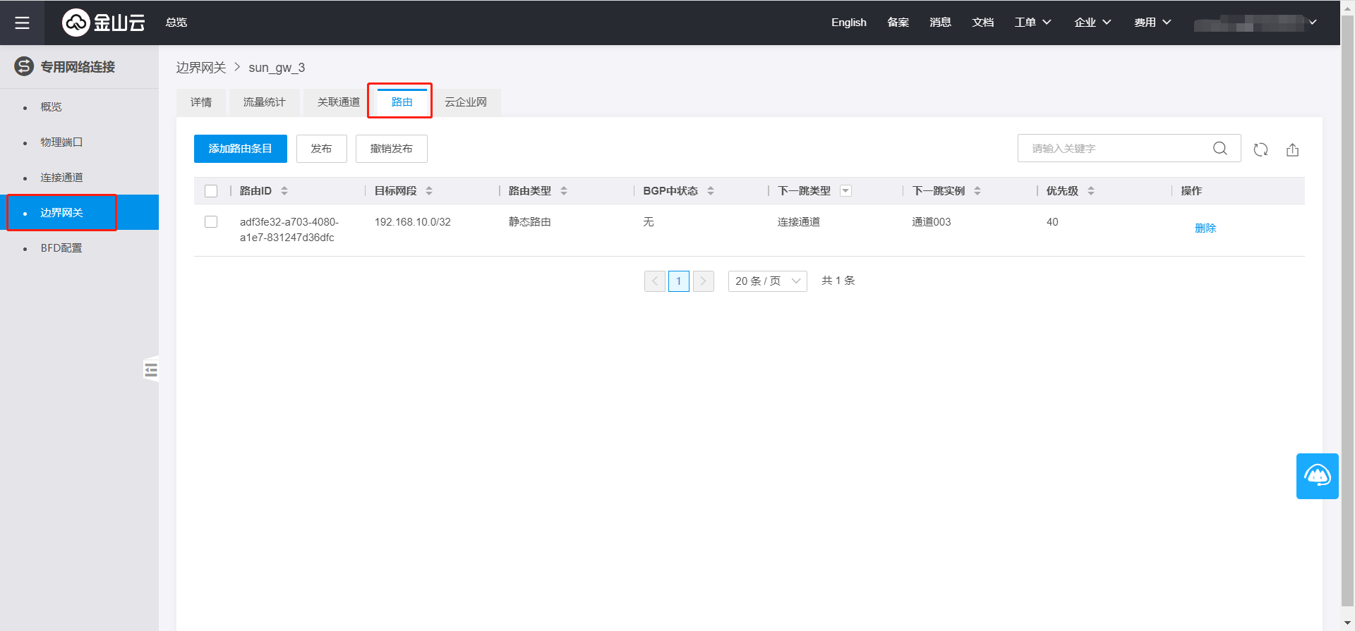 (1)在金山云控制台依次点击【网络】-【专线接入】-【边界网关】选项卡,点击需要配置的边界网关,进入边界网关详情页面。