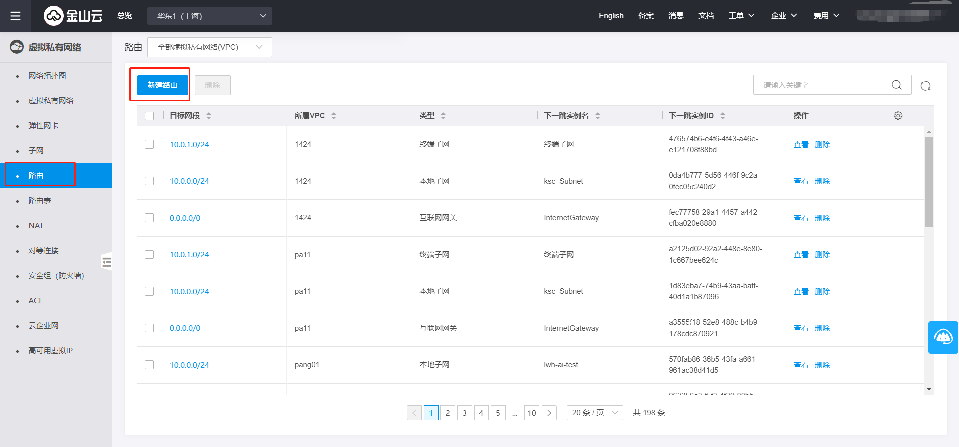 1.在金山云控制台依次点击【网络】-【虚拟私有网络】-【路由】选项卡,进入路由信息页面,点击【新建路由】按钮。
