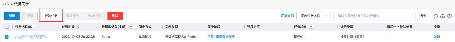 支付成功后同步任务创建完成,单击开始任务后同步任务正式开始。如果您需要对任务进行管理,详见 任务管理。